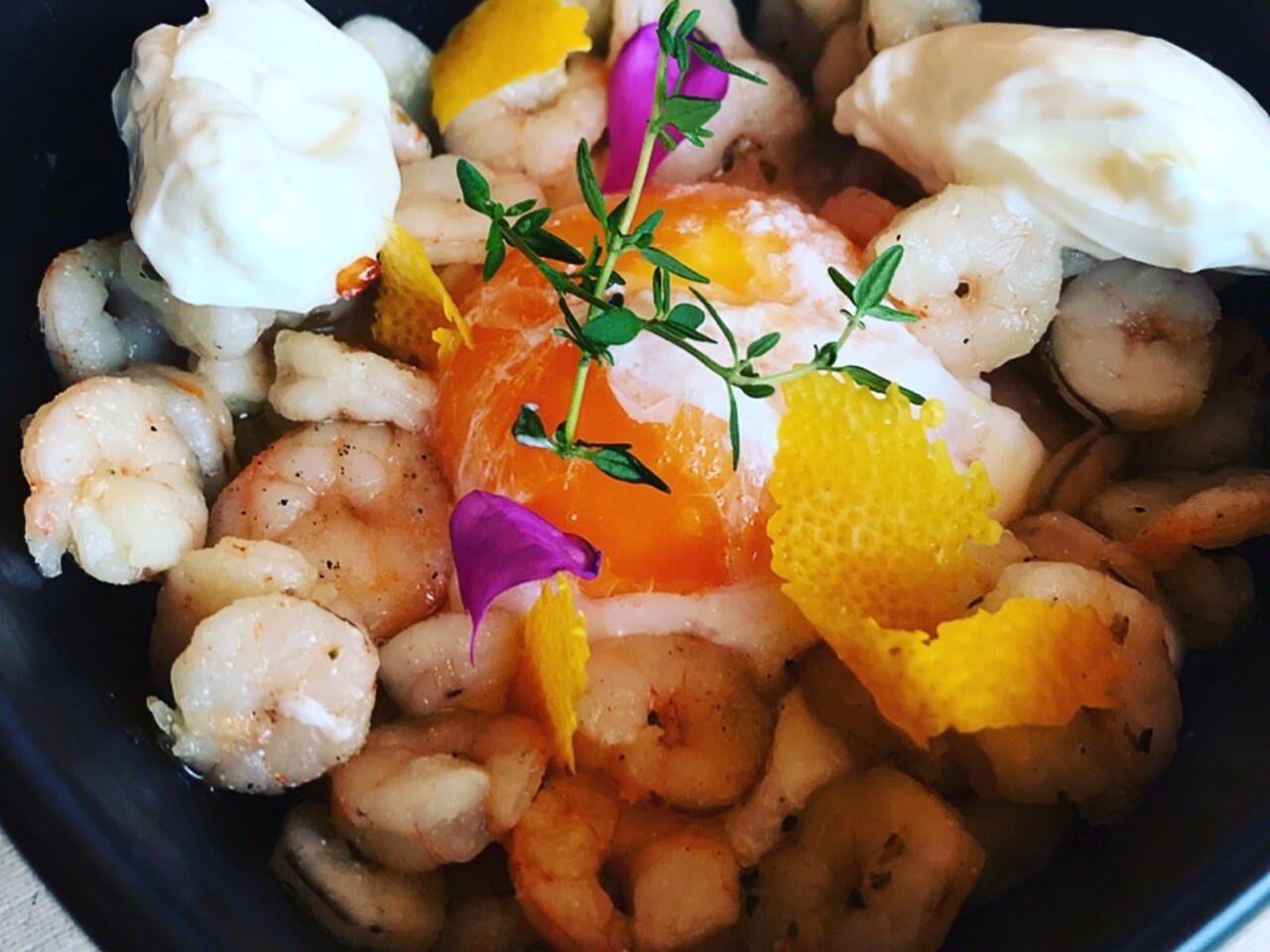 Impiattare l uovo con i gamberetti, un po’ di scorza di limone, due rametti di timo e due que nelle di crema di formaggio