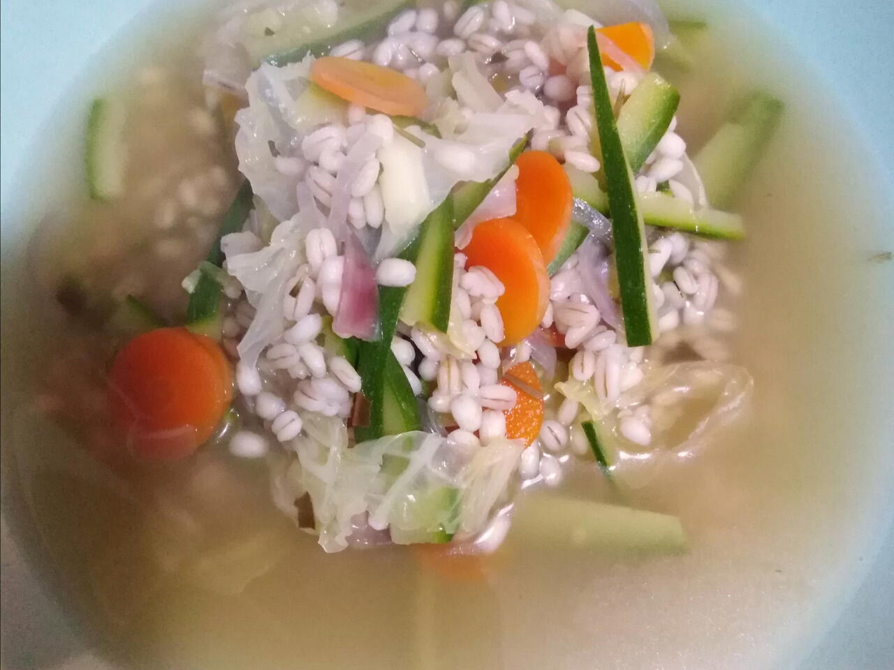 Aggiungere circa 500 ml d'acqua (se vedete che si asciuga troppo aggiungete l'acqua a bicchieri) e aggiungere il dado con il trito di spezie. Cuocere a fuoco vivo per circa mezz'ora. Dopodiché aggiungete circa una tazza ogni due persone D'orzo e lasciate cuocere per i restanti 12 minuti.