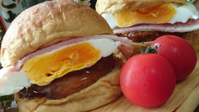 ベーコンエッグ焼いてチルドハンバーグと挟みました(*´∀`*)アハン♡♡