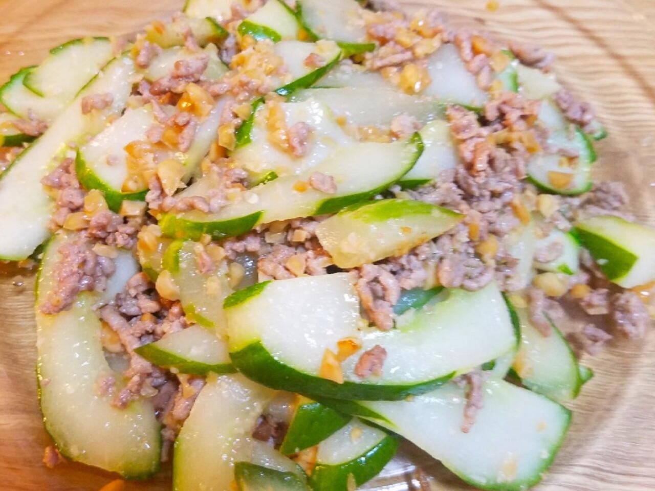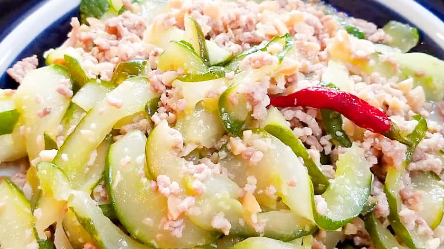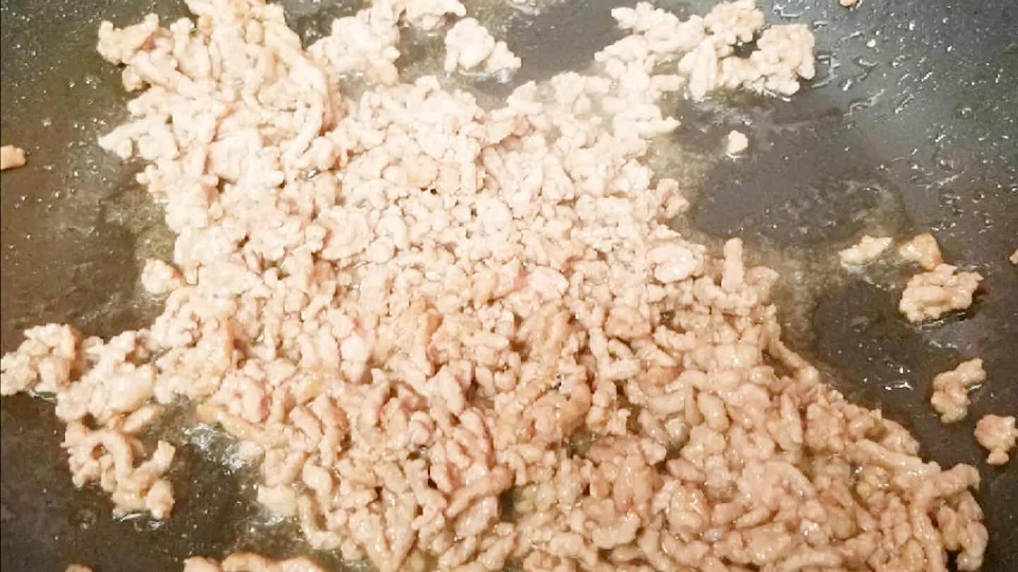 フライパンに胡麻油を熱して豚挽き肉とキュウリを炒める。