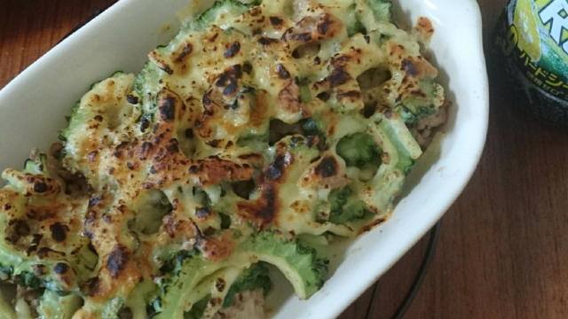 サッと茹でたゴーヤに塩こしょう、マヨチーズでトースターで焼きます