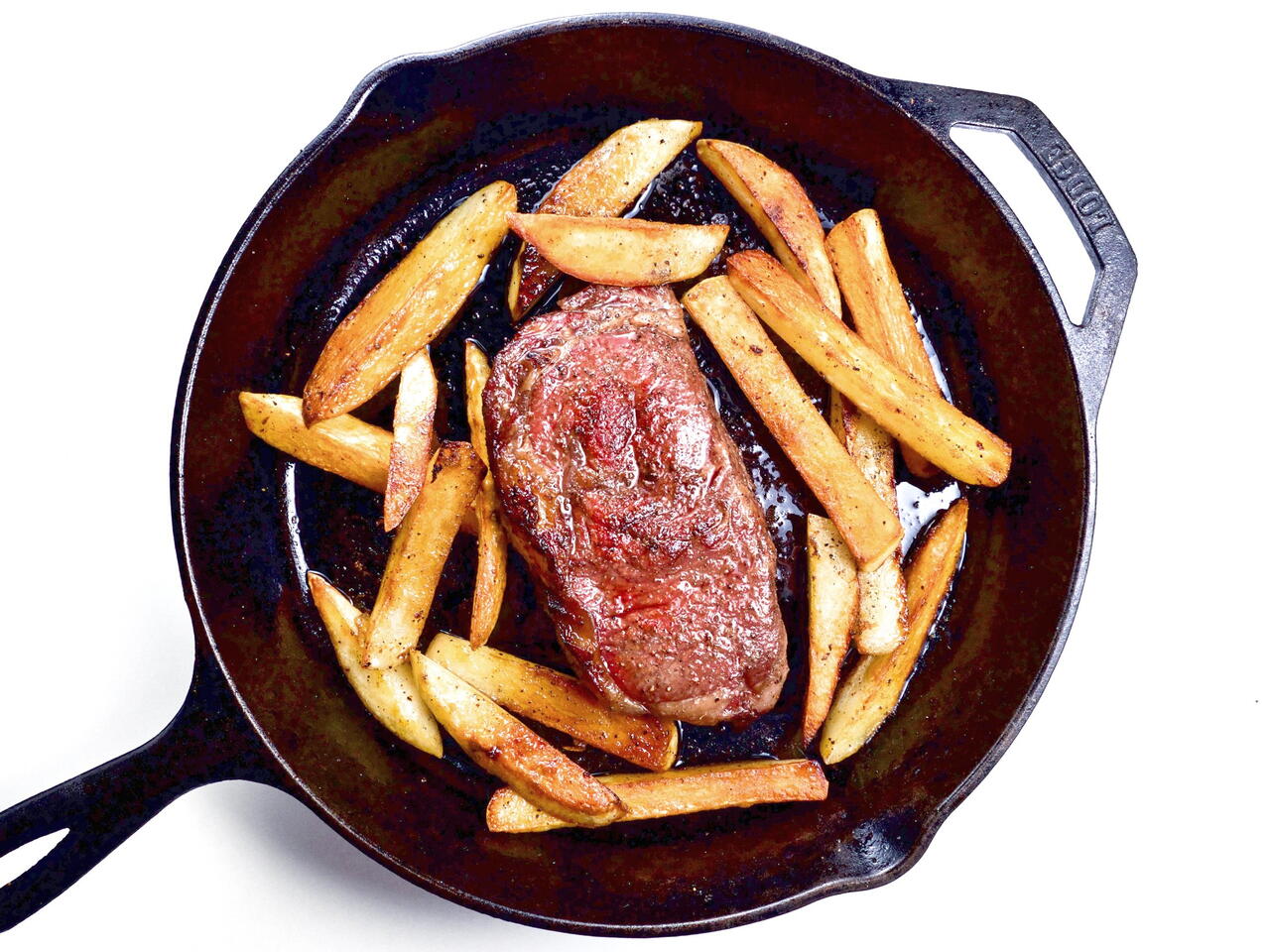 フライドポテト添えリバースシアーリングリブロース:このメニューはクラシックなステーキフリットのフライパン1つで作ることができるバージョンで、最小限のスキルと労力で素晴らしい結果を得ることができます。