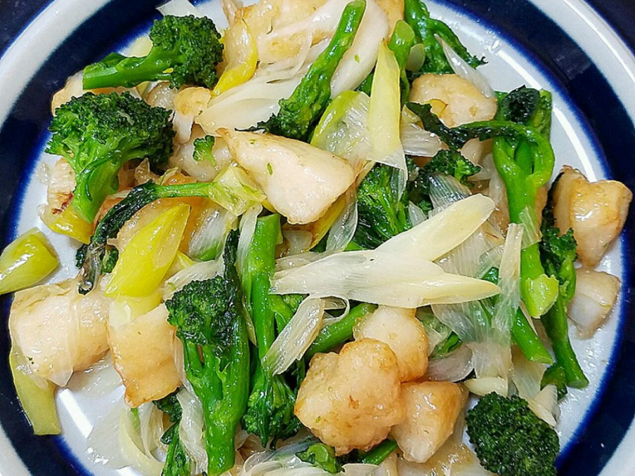 斜め切りした長ネギ1本と固茹でしたブロッコリー約200gを炒めて中華味大さじ1、酒大さじ1で味付け。