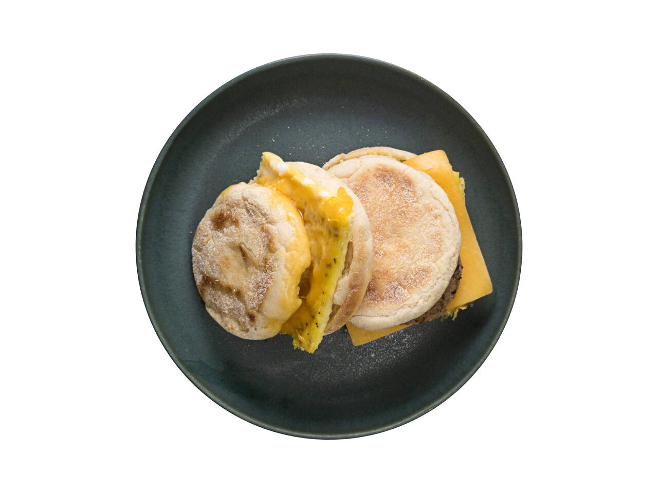 卵を乗せたマフィンの上にスライスチーズとソーセージをのせる。イングリッシュマフィンの上をのせてサンドする。