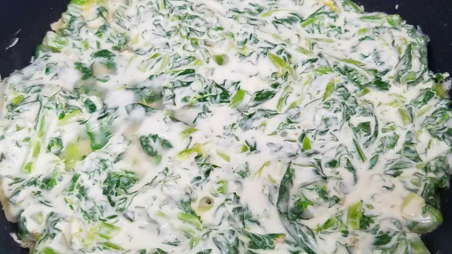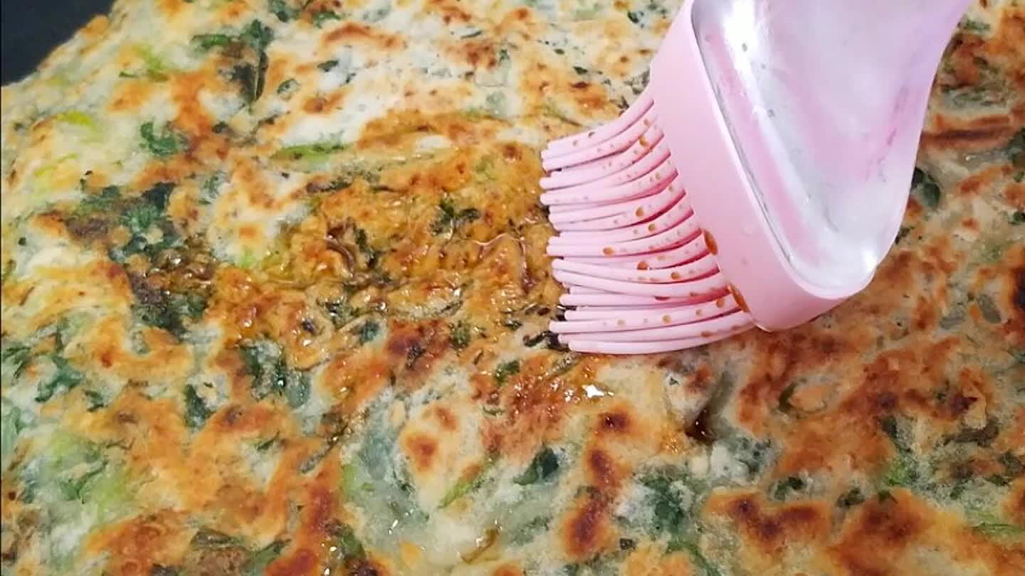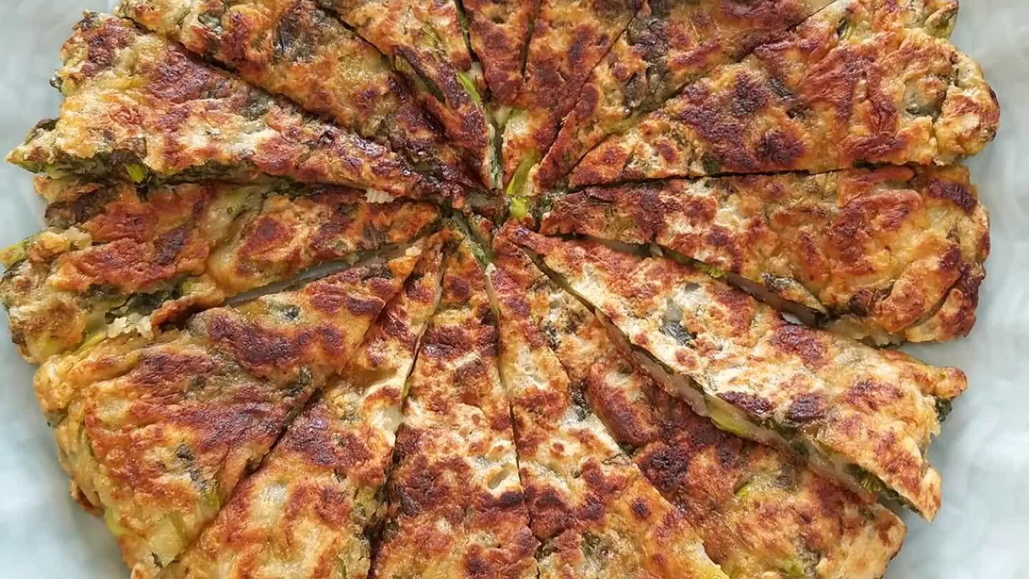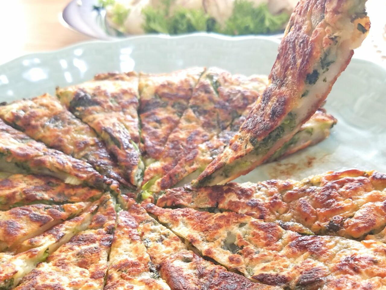 大根葉っぱ、餅、とろけるチーズを入れたこんがりチヂミ。