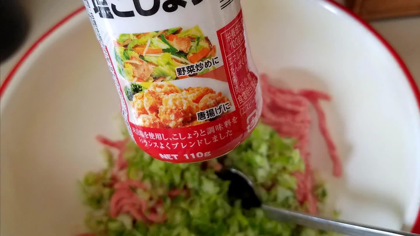 塩コショウ少し、醤油大さじ1、胡麻油大さじ1/3を混ぜる。