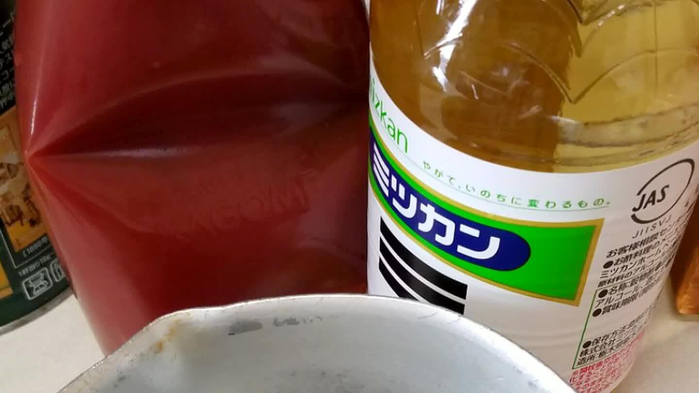 ケチャップ大さじ2、酢大さじ2、砂糖大さじ2、醤油大さじ1.5を小鍋で熱する。水100ccで溶いた片栗粉大さじ1/2でとろみを付ける。