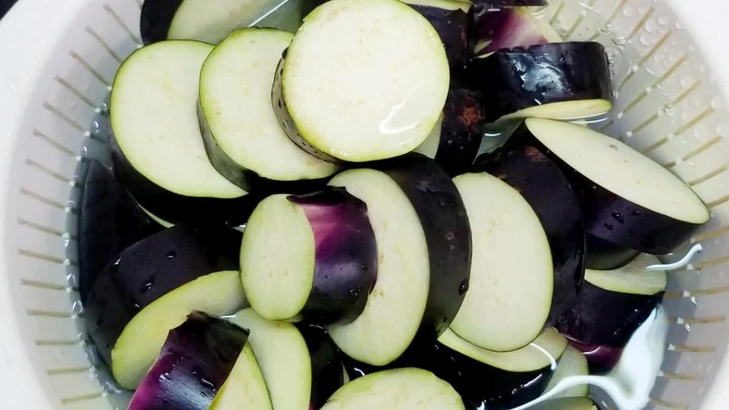 ナス5本は輪切りにして水にさらす。キノコ(ブナシメジなど)はいしづきを取り除いて、さっと洗う。