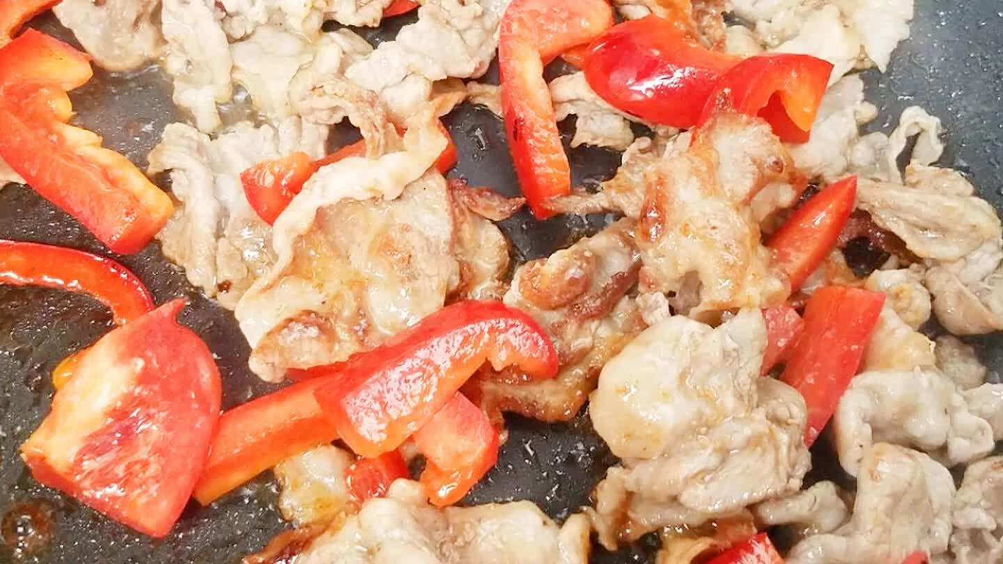 豚薄切り肉とパプリカを胡麻油を熱したフライパンでこんがり焼く。