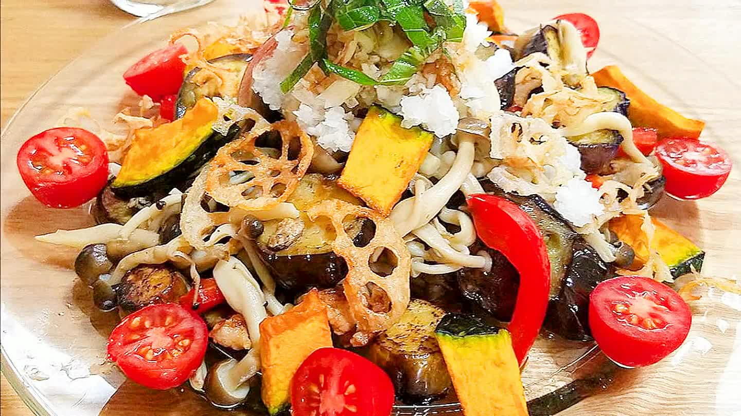 ナス、キノコ、豚肉、パプリカを皿に盛り付け、素揚げのカボチャとレンコンを散らす。上に大根おろし、大葉、ミョウガをトッピングしてポン酢でどうぞ!