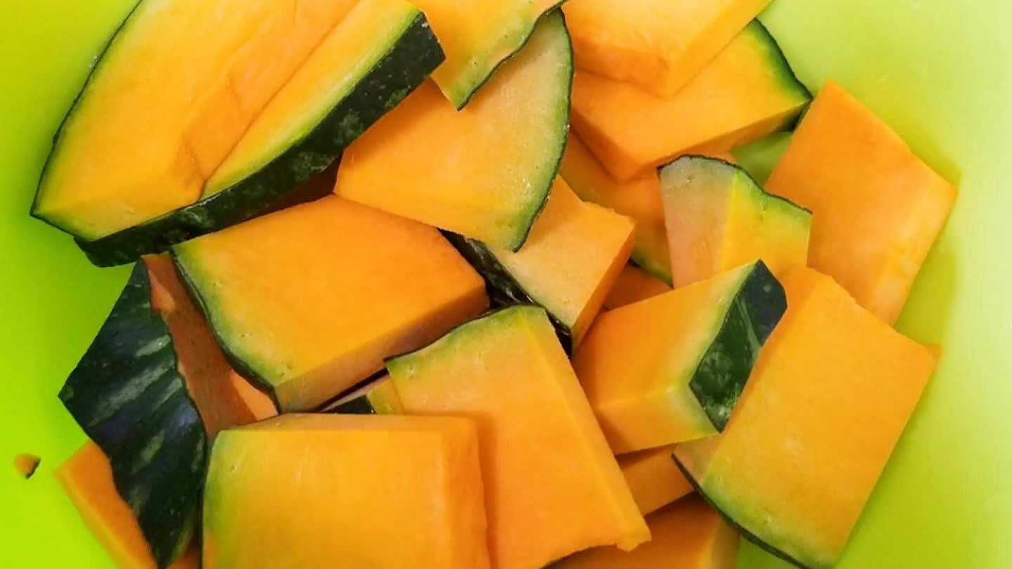 カボチャは5㎜の厚さに切る。レンコンは厚さ3㎜に切って水にさらす。
