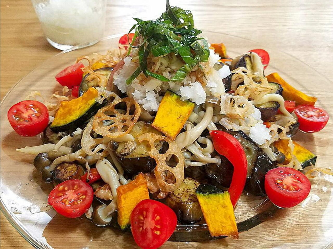 ナス、キノコ、豚肉、パプリカを皿に盛り付け、素揚げのカボチャとレンコンを散らす。上に大根おろし、大葉、ミョウガをトッピングしてポン酢でどうぞ!