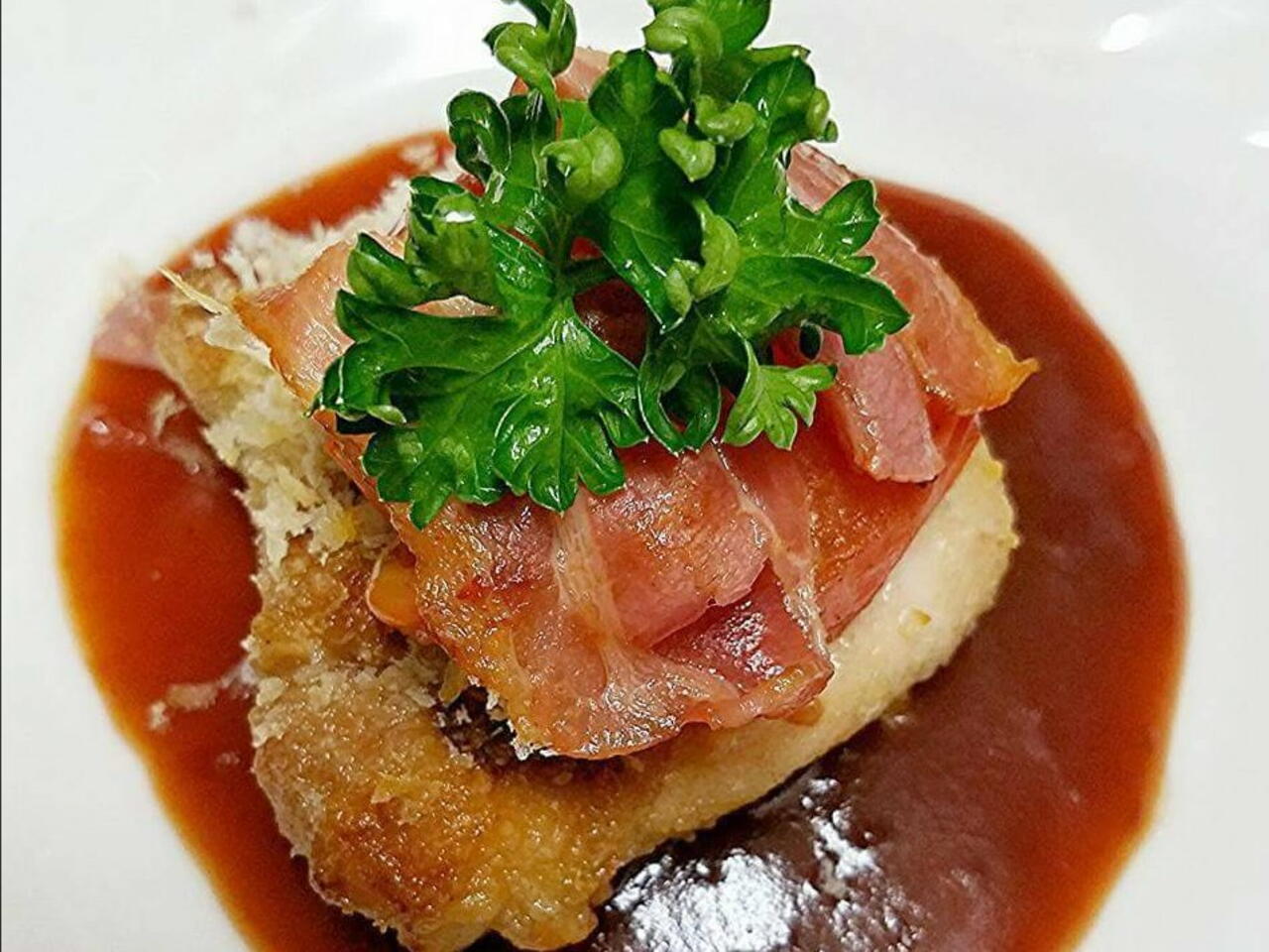 肉を焼いたフライパンに赤ワイン大さじ3、水300~400cc、コンソメキューブ1、ケチャップ大さじ3、ソース大さじ3を入れて煮詰める。水溶き片栗粉でとろみ。フライパンで焼いたトマト、ベーコン。最後にパセリや水菜トッピング🌿