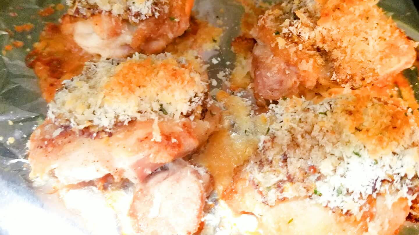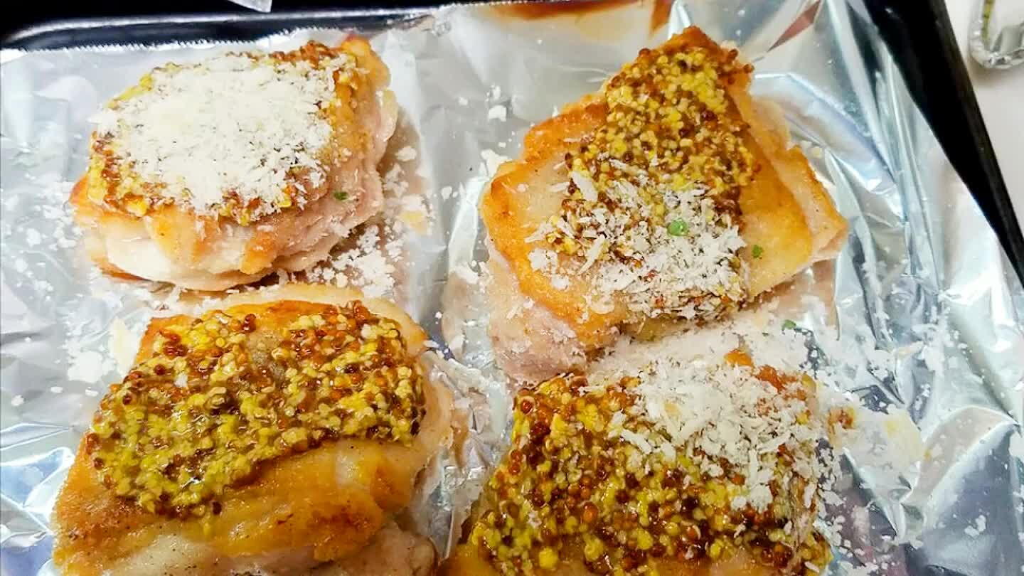 クッキングシートを敷いたオーブン皿に肉を皮目を上になるように並べ、粒マスタードを塗りパン粉をのせる。