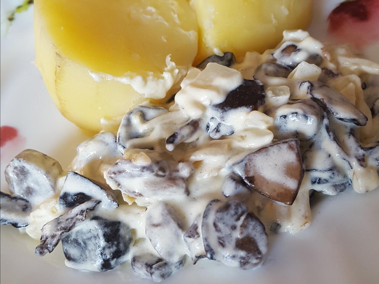 Grybus kepti ant keptuvės. Įberti druskos ir pipirų. Kai baiginės kepti grybai ant galo sudėti svogūnus, kepti kol svogūnai ir grybai iškeps ir ant galo pilti grietinę, viską išmaišyti ir pakepti keletą minučių. Valgyti su bulvėmis ( šviežiomis labai skanu). SKANAUS 😉
