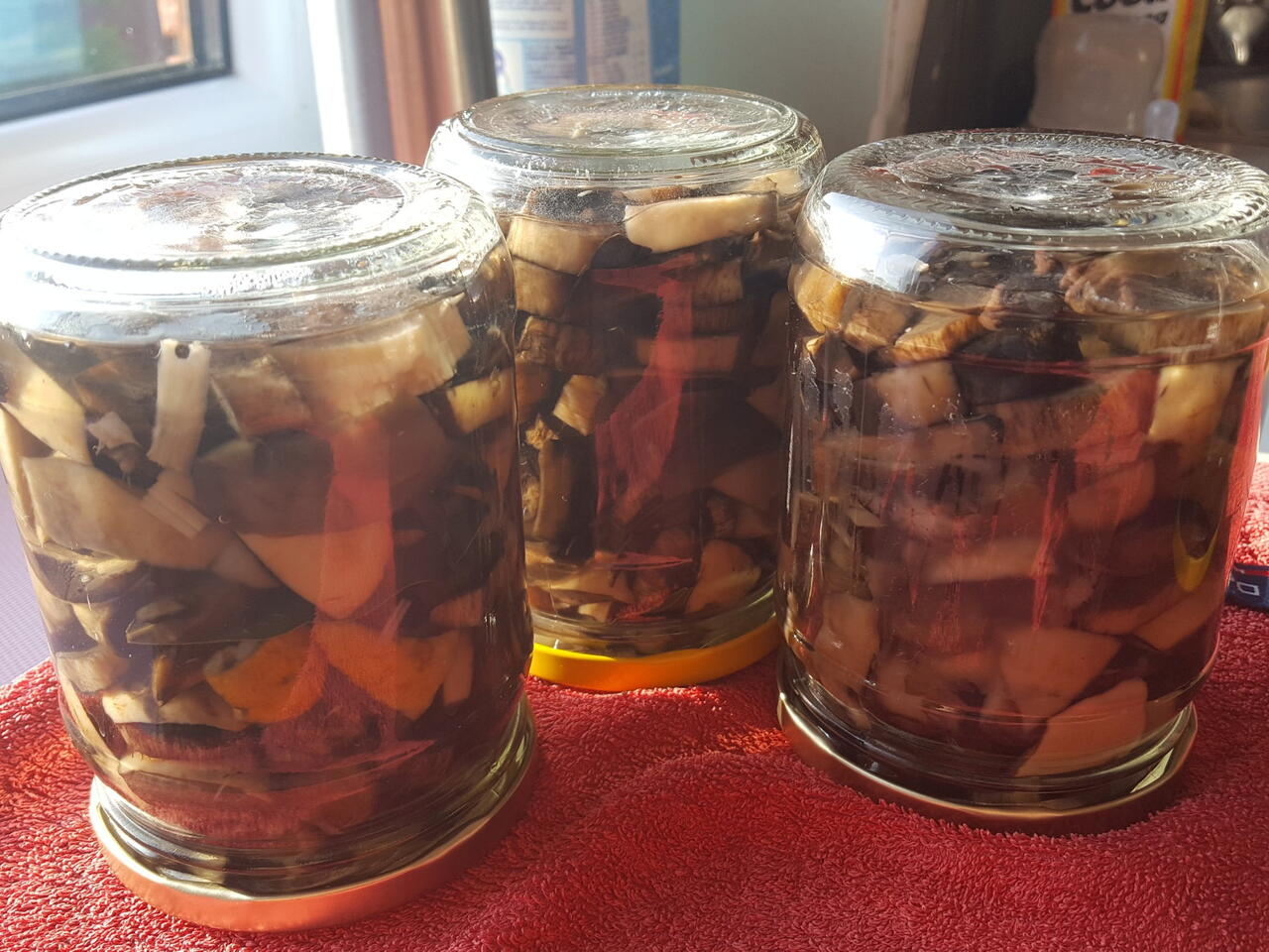 Atskiram vandenį pasidaryti marinatą. Į užvirusį 1ltr vandens sudėti: cukrų, druską, pipirus ir lauro lapus. Supilti marinatą ant nukoštų grybų ir užvirinti, ant galo supilti actą. Užvirinti ir viską supilti į stiklainius. Grybai žiemai 😊