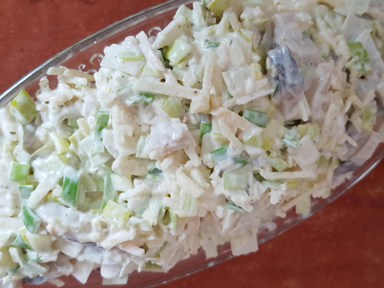 Į supjaustytus ingridientus sudedame majonezą bei grietinę, įspaudžiame citrinos sulčių, įdedame cukraus ir viską gerai išmaišome.