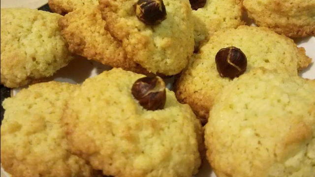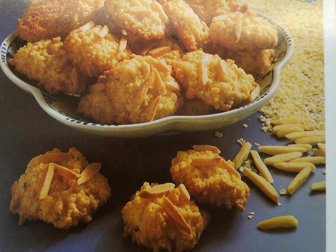 3. Dviem šaukšteliais iš tešlos formuoti tešlainius ir dėti riebalais išteptą kepimo skardą. Į kiekvieną tešlainį įspausti po kelis kapotus migdolus.
