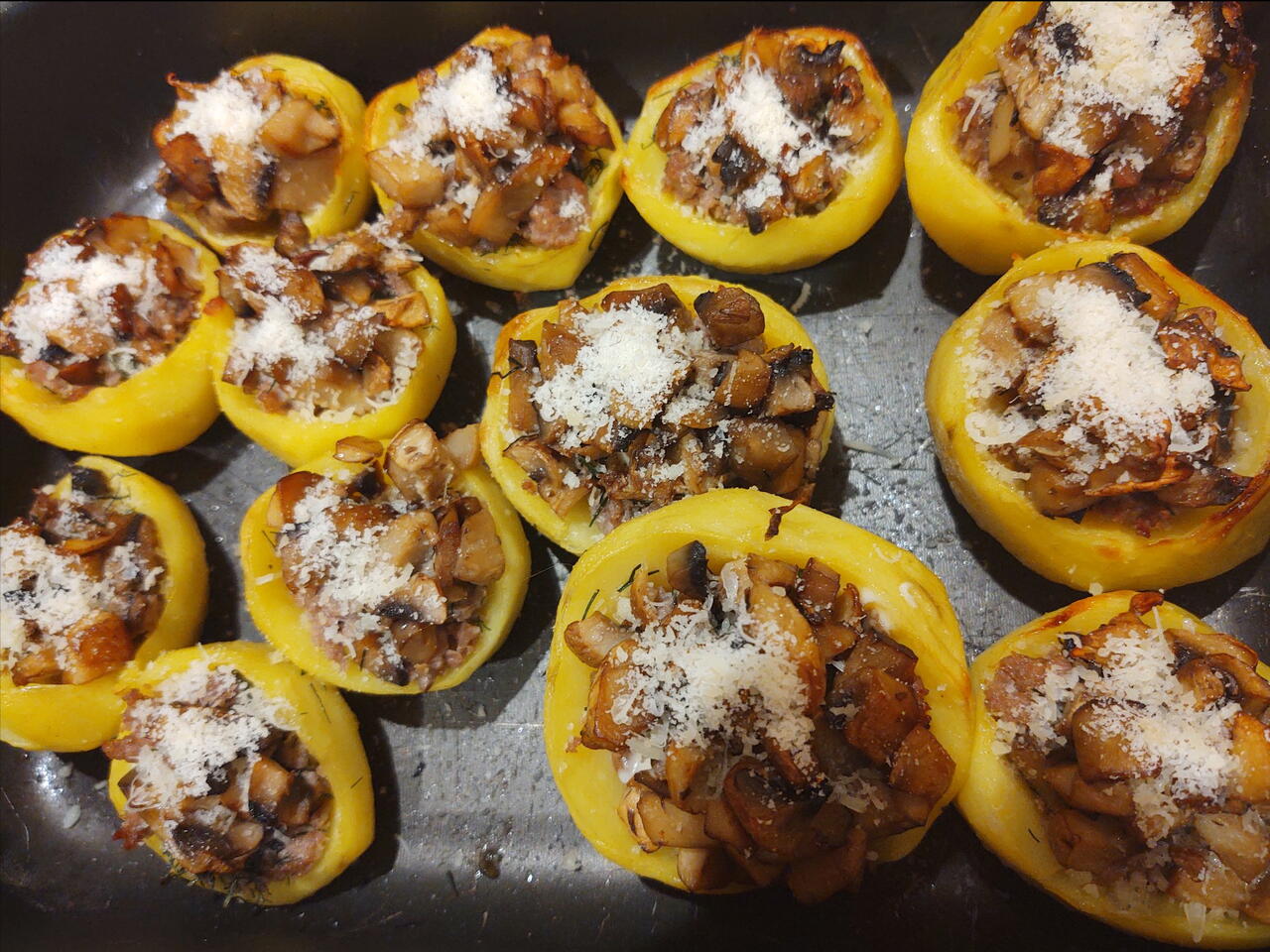 Kamēr cepas šampinjoni un gaļa, tikmēr var izgreb kartupeļus. Izgrebto nemet ārā un pataupa nākamās dienās ēdienriezei, ja ir tāda vēlme. Izgrebtos kartupeļus apslaka ar eļļu un ieliek cepeškrāsnī līdz galam izcepties un apbrūnināties.