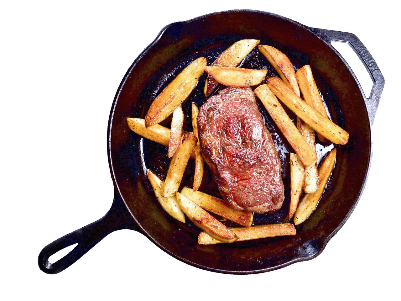 Bife ancho con sellado inverso y papas fritas. Esta es la versión del clásico bife con papas fritas pero en una olla, y da muy buenos resultados con requerimientos y esfuerzos mínimos.