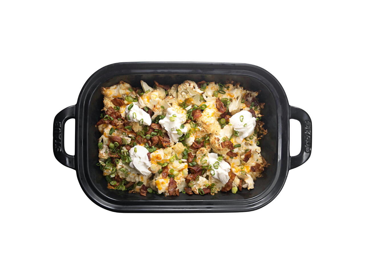 Una vez fuera del horno, cubre el coliflor con el tocino crujiente, las cebolletas y cucharadas de la crema agria.