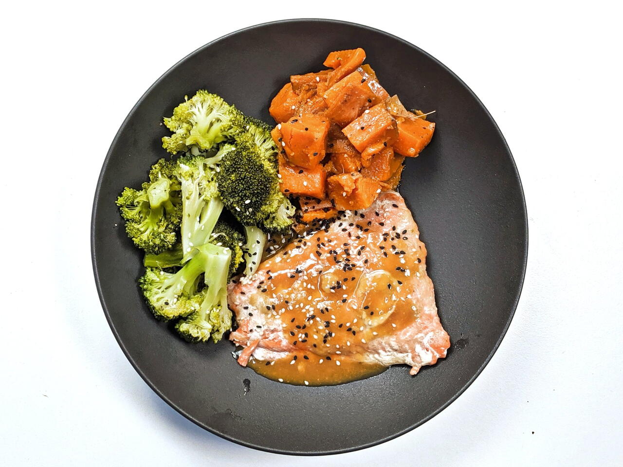 Repartir el brócoli, los boniatos y el salmón en dos platos y verter el resto del glaseado de miso por encima. Servir inmediatamente y disfrutar de tu cena caliente en 10 minutos.
