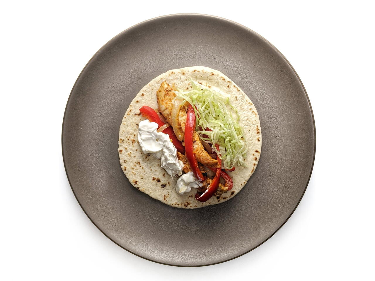 Calienta las tortillas y prepara el espacio para tu fajita. Un poco de pollo, esparce un poco de lechuga y una cucharada de crema agria.
