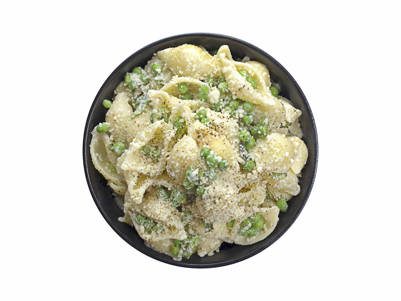 Agrega la pasta bien caliente. La pasta recién hervida, debe estar lo suficientemente caliente para calentar la crema, derretir el queso y calentar los chícharos.