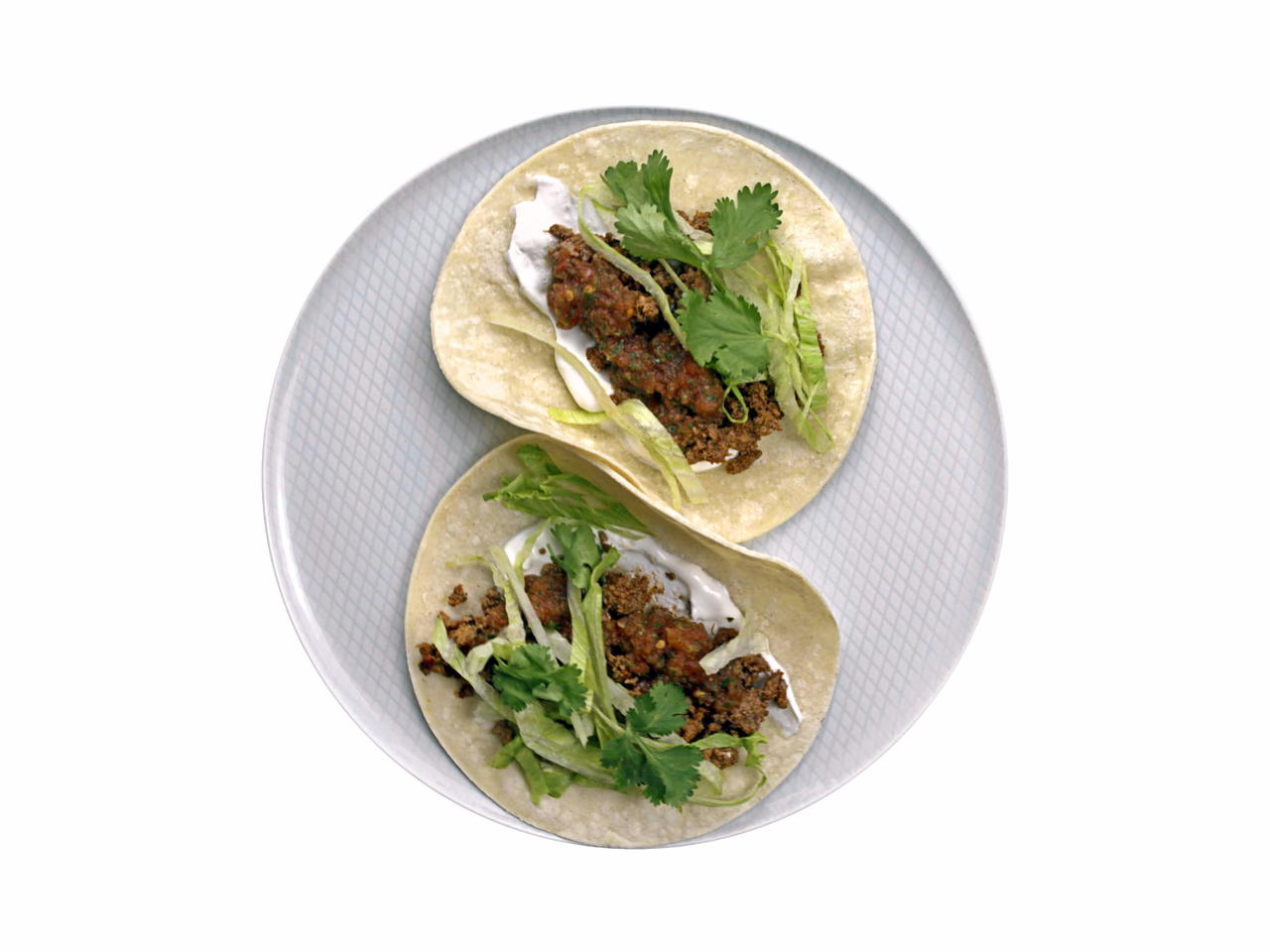 ¡Noche de tacos! Carne molida sazonada con crema agria, lechuga, salsa y cilantro.