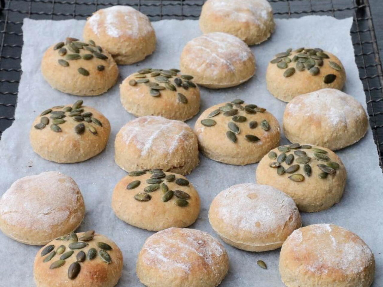 Pensle gjerne sconesa med litt vatn og ha over frø/kjerner/havregryn om det er ønskelig. Steik midt i ovnen i 10-15 minutt, eller til sconesa er lett gylne på oversida og undersida. Pass på å ikkje steike for lenge – då blir dei tørre. Avkjøl på rist