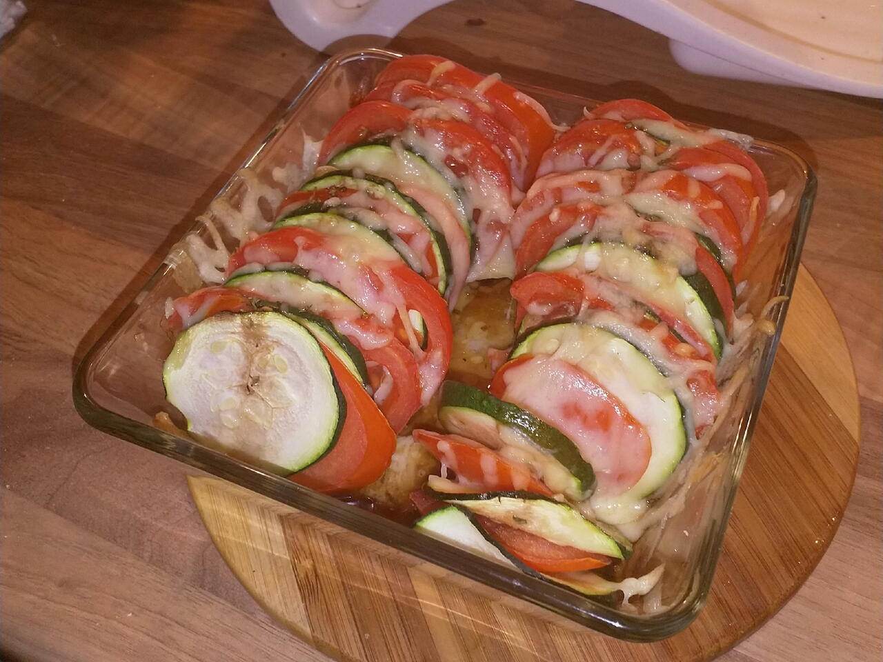 Verwarm de oven voor op 180 ºC. Snijd de tomaten en courgette in plakjes. Vet de ovenschaal in. Leg de plakjes courgette en tomaat in de ovenschaal.