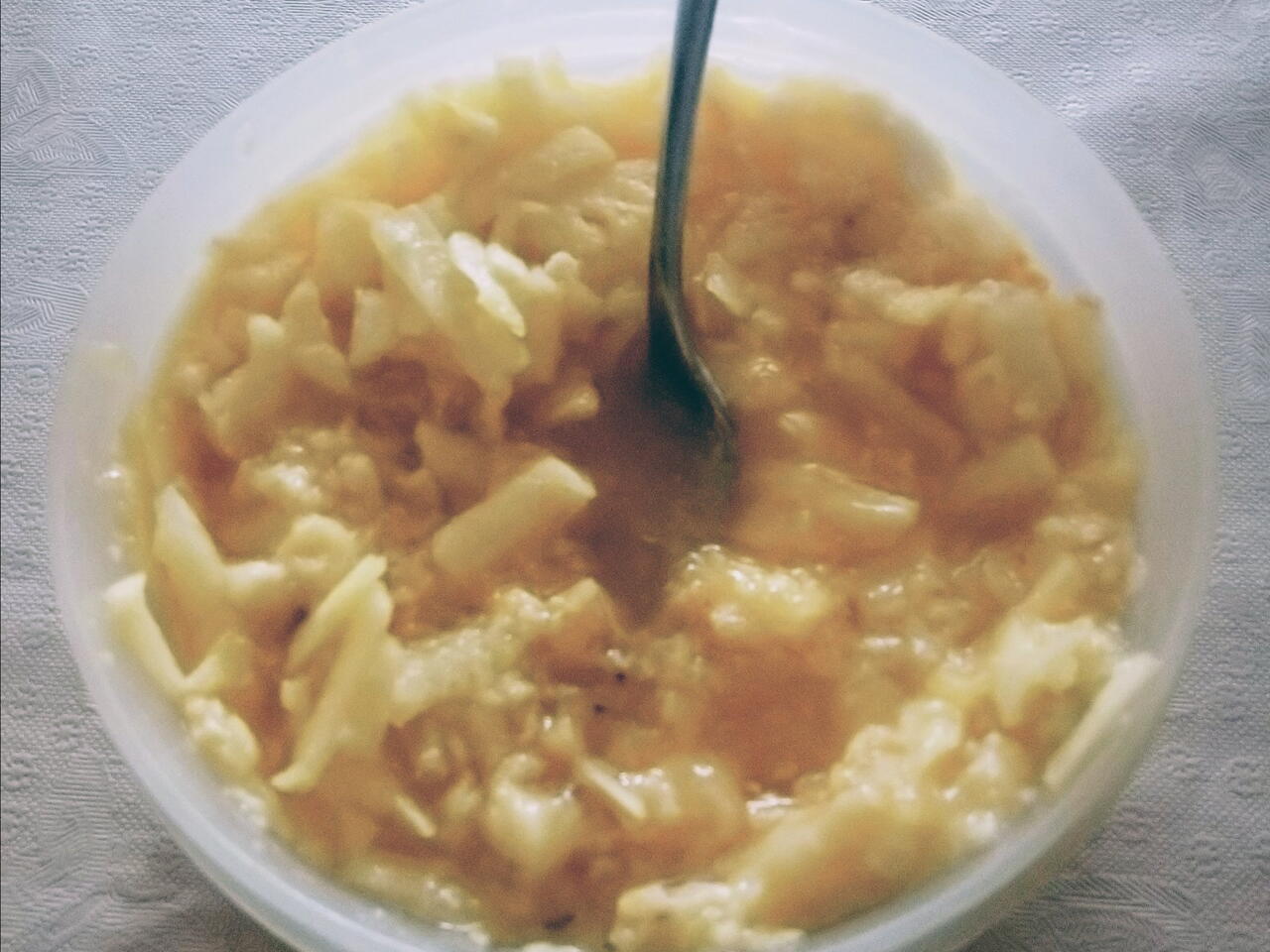 Prak (of pureer) alles fijn en zorg dat alles goed door elkaar geroerd is. Eet smakelijk!