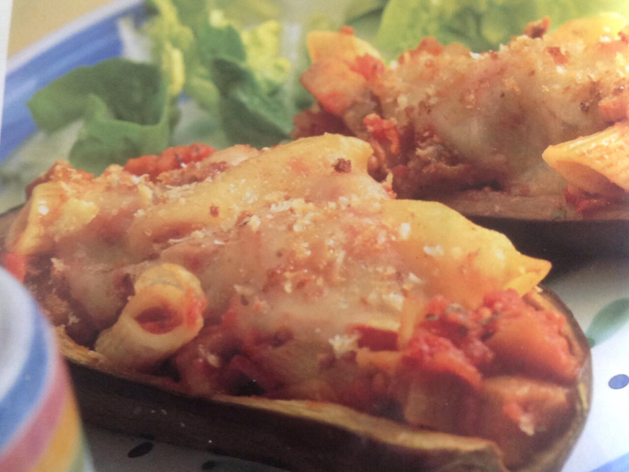 Vet de bodem van een ovenblik in met olie en leg de auberginehelften er naast elkaar in. Verdeel de helft van het tomatenmacroni mengsel over de helften. Snijd de bol mozzarella in 8 plakjes. Verdeel ze over de vier helften. Doe de rest van de vulling erover.