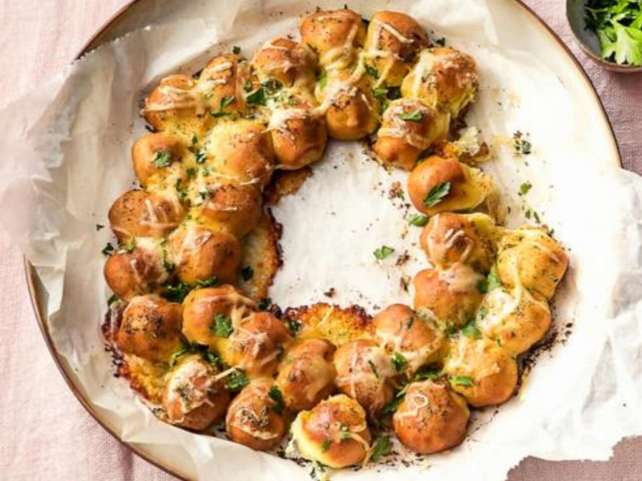 Snijd ondertussen de peterselie fijn. Schuif met behulp van het bakpapier de krans op een serveerschaal en bestrooi met de peterselie.