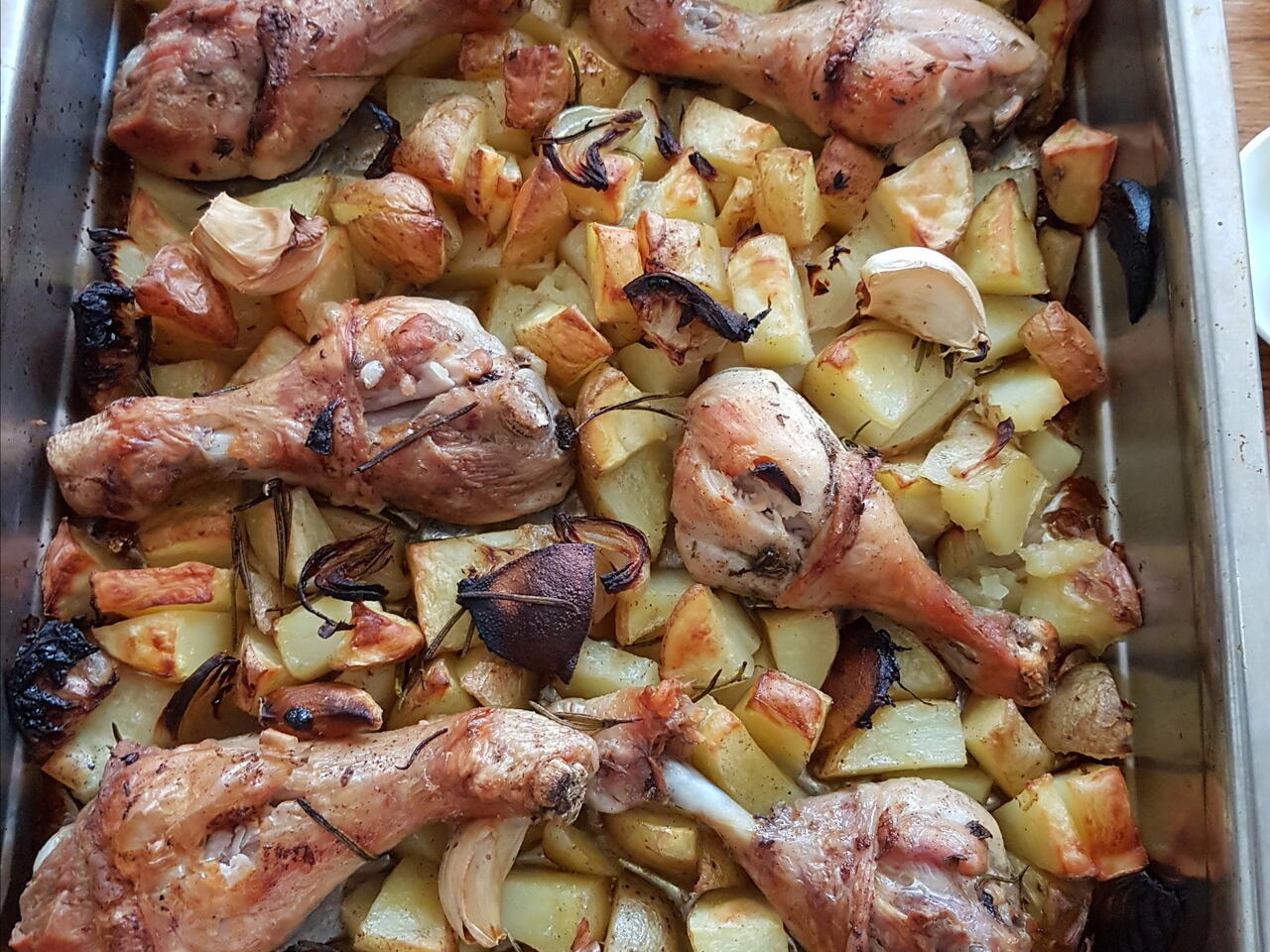 Leg de kip tussen de aardappelblokjes, geef de hele tenen knoflook in schil ook een plaatsje. Voeg alles wat nog in de kom zit aan kruiden en marinade erbij. Ik heb er ook nog een in ringen gesneden ui aan toegevoegd.