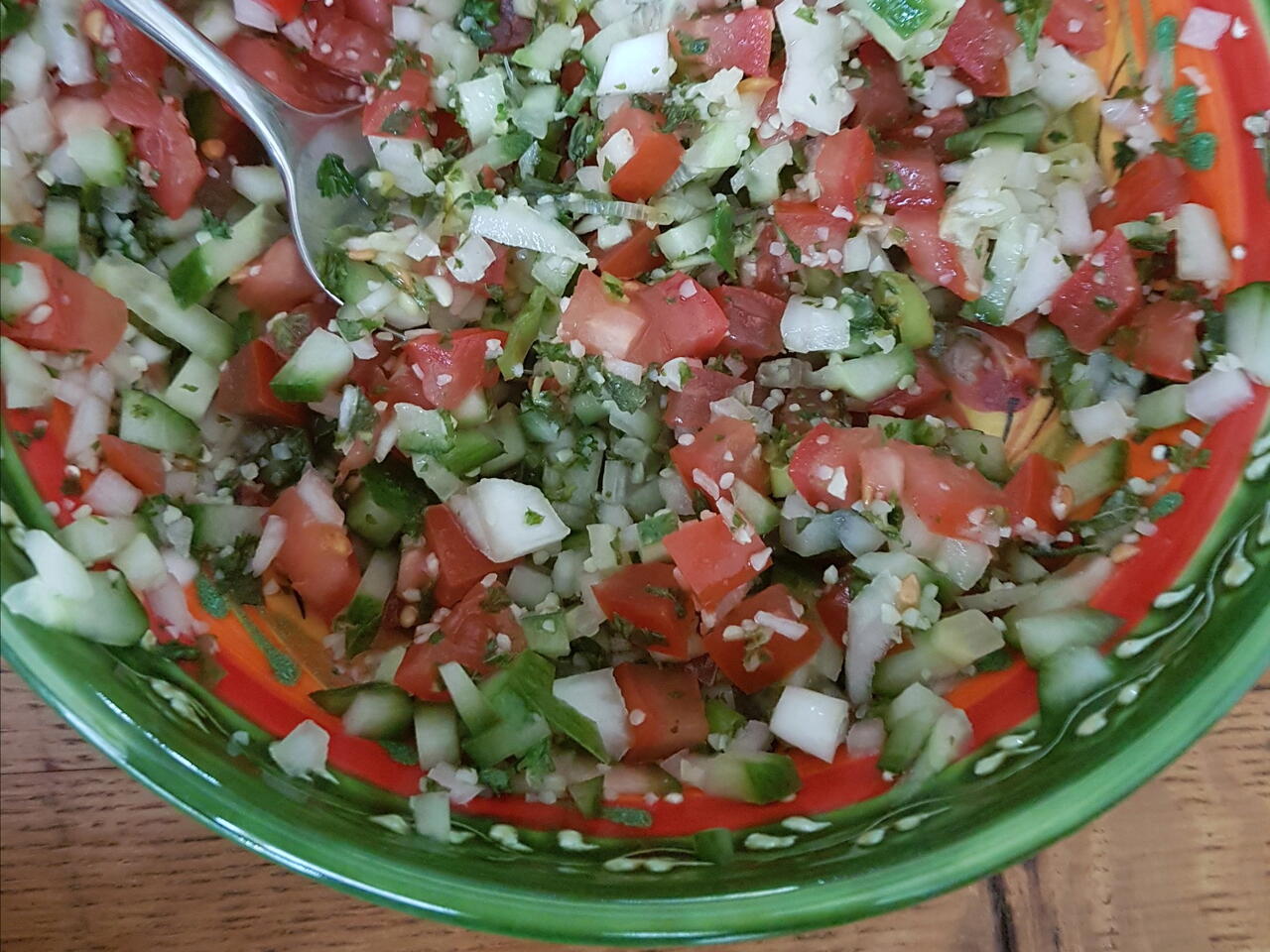 Snij de ui fijn en de tomaten in kleine blokjes, voeg alles bij elkaar ook de inmiddels afgekoelde bulgur.