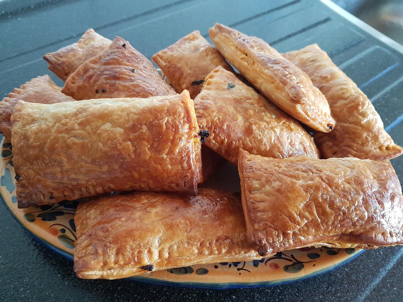 Vouw het deeg bubbel en prak de randjes vast met een vork. Leg ze op een met bakpapier bedekte bakplaat.Smeer er wat geklopt ei overheen voor de glans.