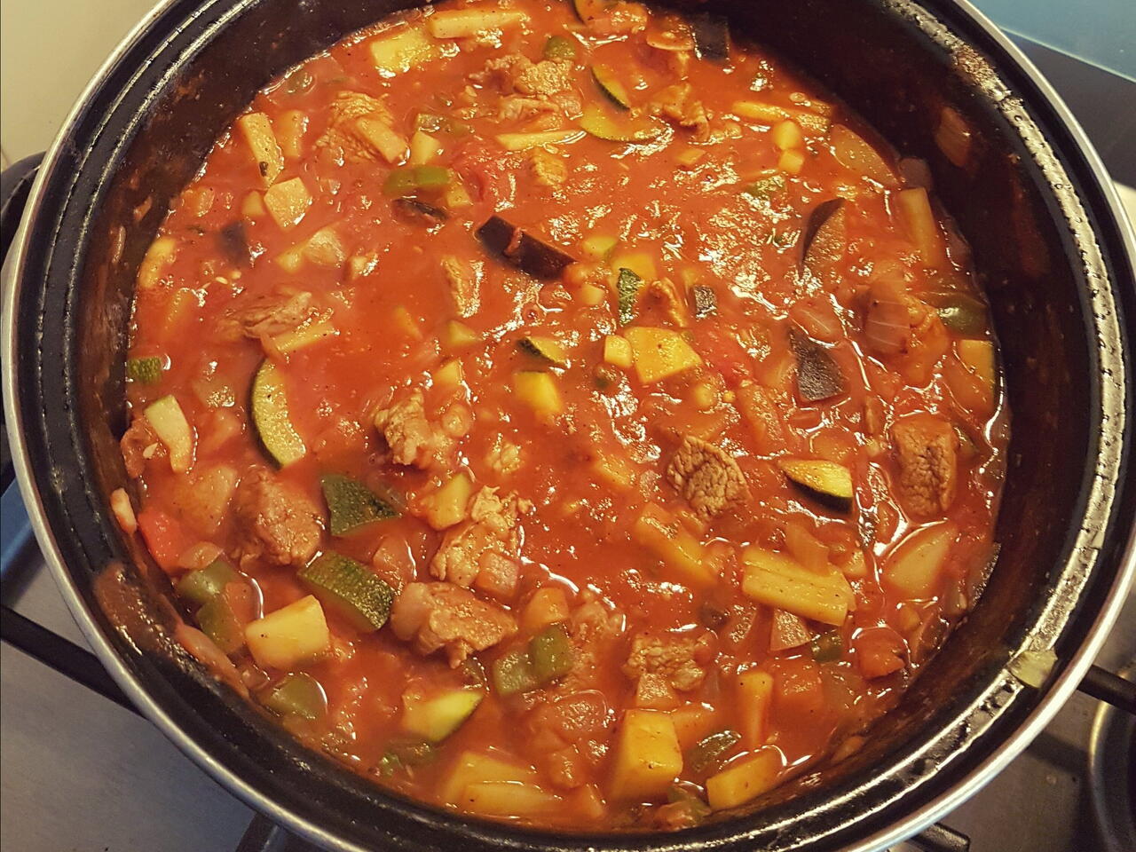Bak in de wok met wat olie eerst aardappels goed roeren dan de courgette, en vervolgens de aubergine weer even roeren en pepers, dan de tomaten. Als alles in de pan zit even kort de tomatenpuree meebakken en 3 blikjes water toevoegen, ook het vlees kan er nu bij.