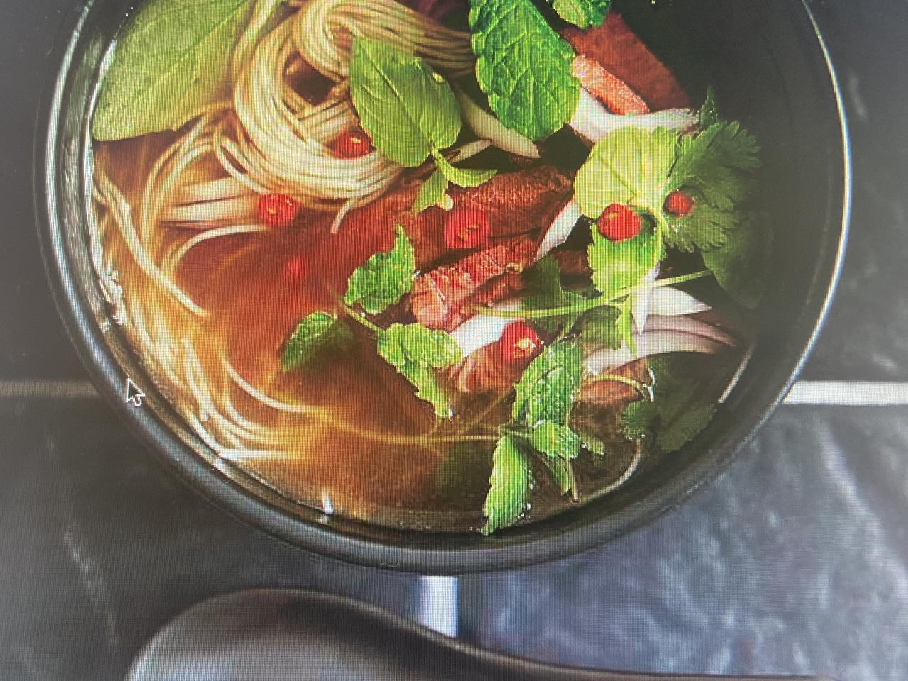Snijd het gebraden vlees, de rode ui en chilipeper in plakjes. Wanneer de bouillon klaar is, voeg deze dan toe.