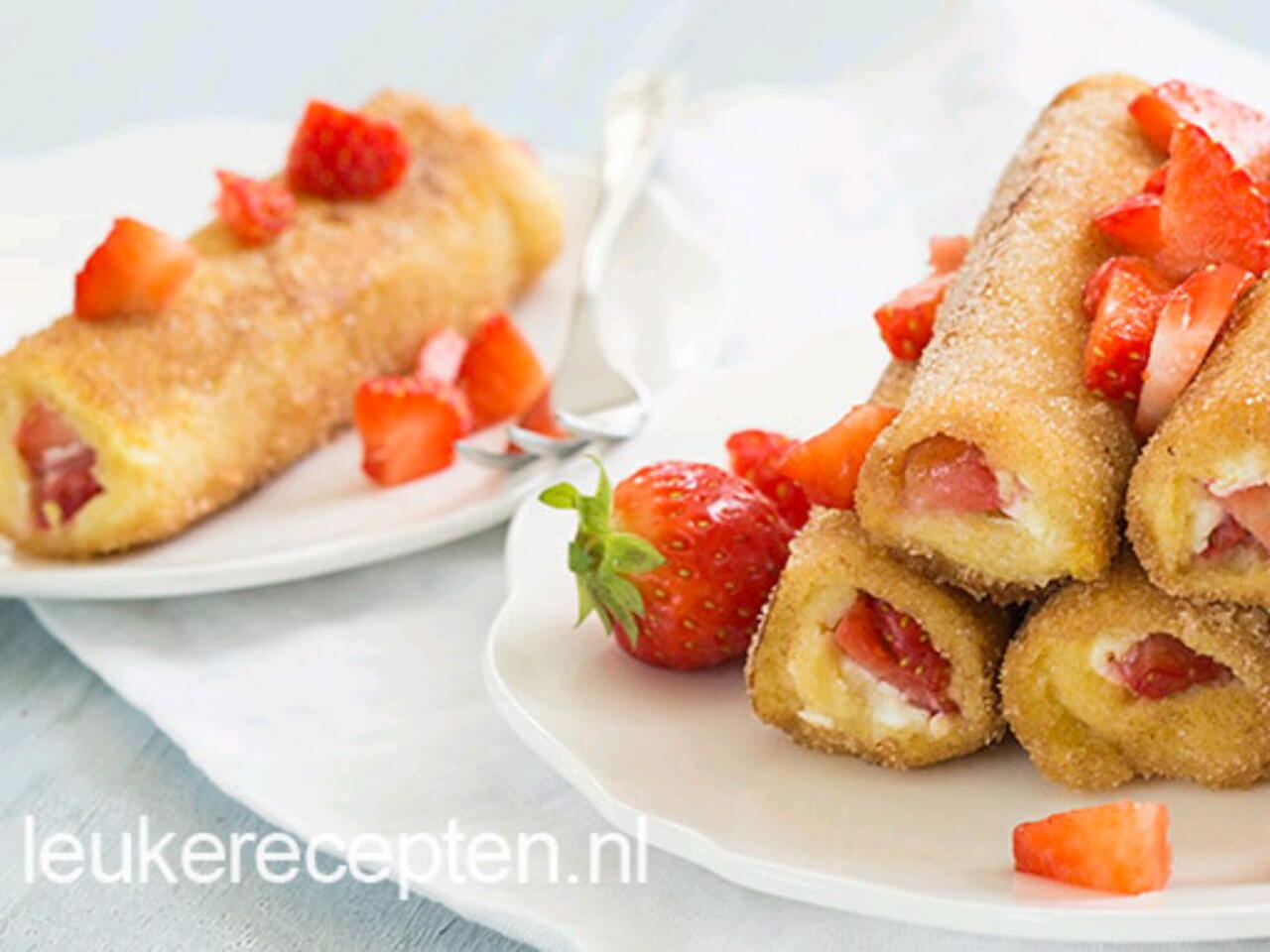 Klop de eieren los met de melk en kaneel. Haal de rolletjes brood hier door. Verhit wat boter of margarine in een pan en voeg de broodrolletjes toe. Draai ze regelmatig om. Als ze na een paar minuten mooi goudbruin zijn geworden zijn ze klaar. Meng de suiker met met kaneel op een bord en rol hier de rolletjes doorheen. Serveer de wentelteefrolletjes met wat extra aardbeien.
