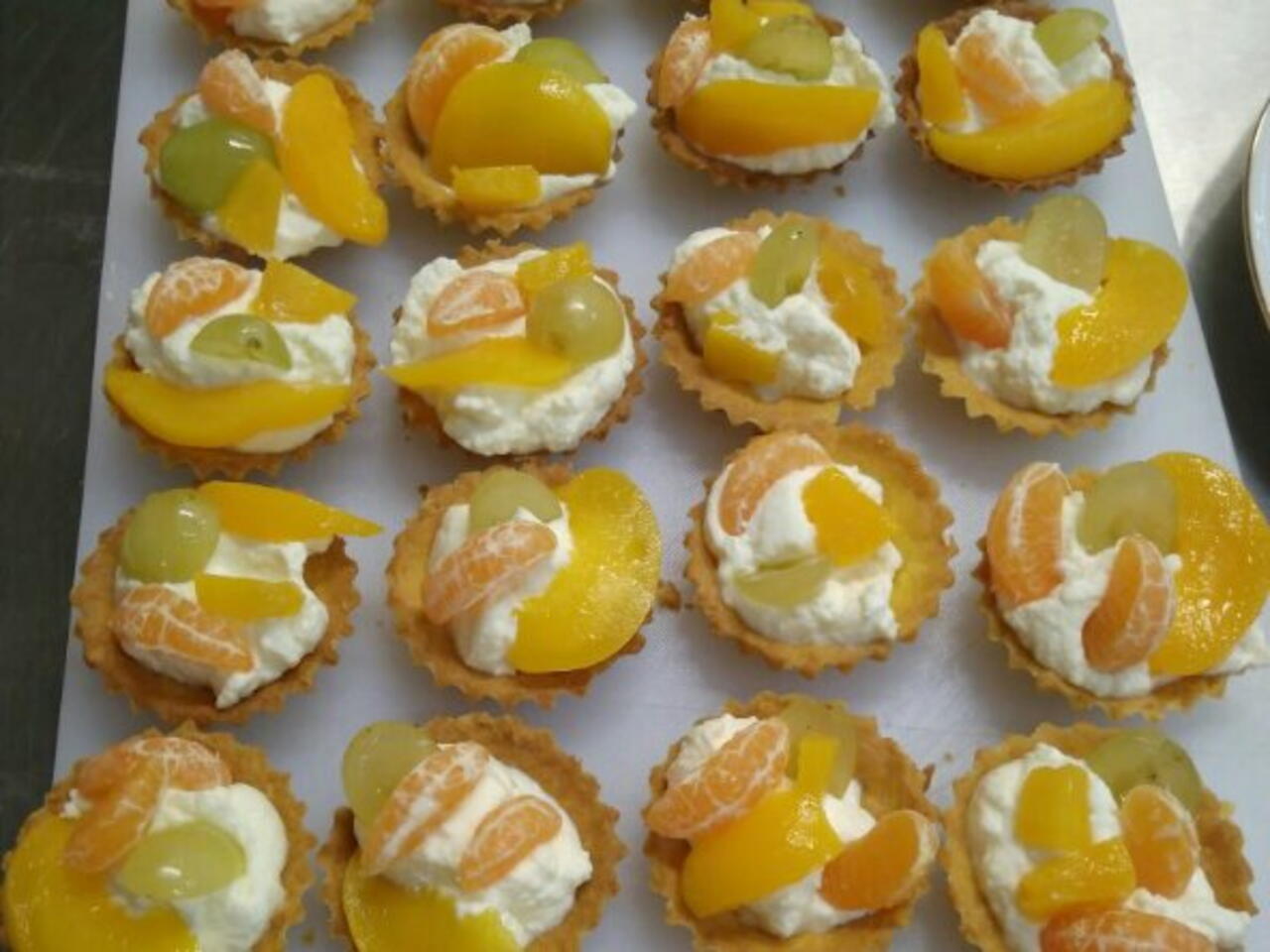 Po wystudzeniu nakładać bitą śmietanę workiem cukierniczym i dekorować owocami.