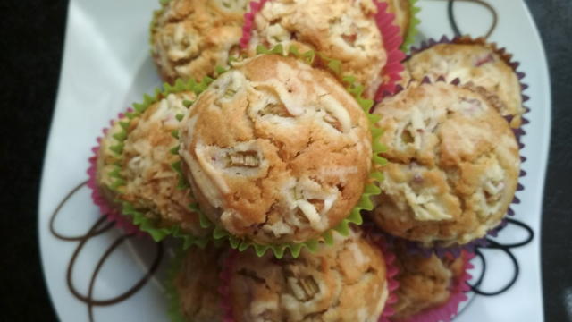 Mokre składniki przelewamy do suchych, dodajemy rabarbar i wszystko mieszamy razem