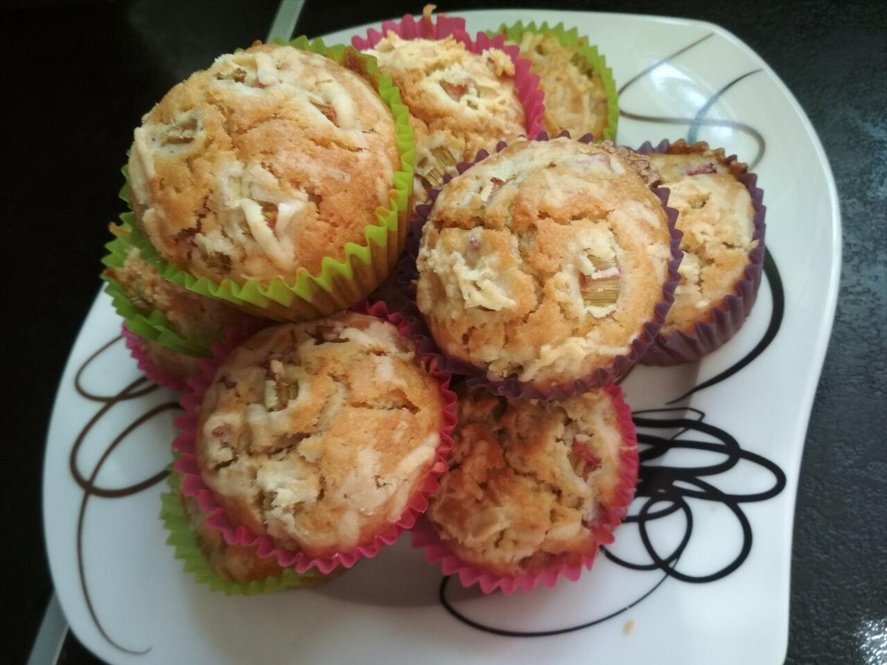 Ciasto po łyżce nakładamy do papilotek. Na wierzch każdej babeczki dajemy kruszonke (mnie została po poprzednim cieście, niżej dam przepis jak zrobić) oraz rabarbar