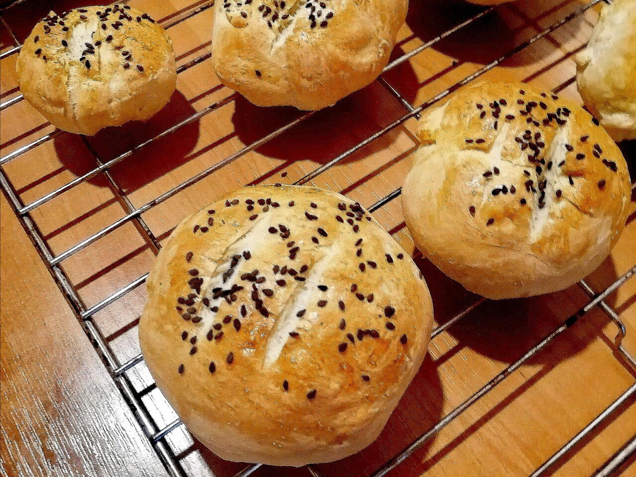 Przed włożeniem bułeczek do piekarnika smarujemy je białkiem i posypujemy sezamem. .