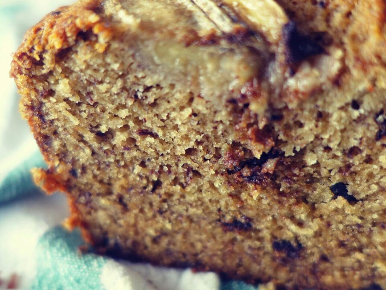 Do osobnej miski przesiewamy mąkę i mieszamy ją z pdp. Dodajemy do masy razem z posiekaną czekoladą i mieszamy łopatką. Przelewamy do formy wyłożonej papierem do pieczenia, na wierzchu kładziemy pozostałego banana, przekrojonego wzdłuż