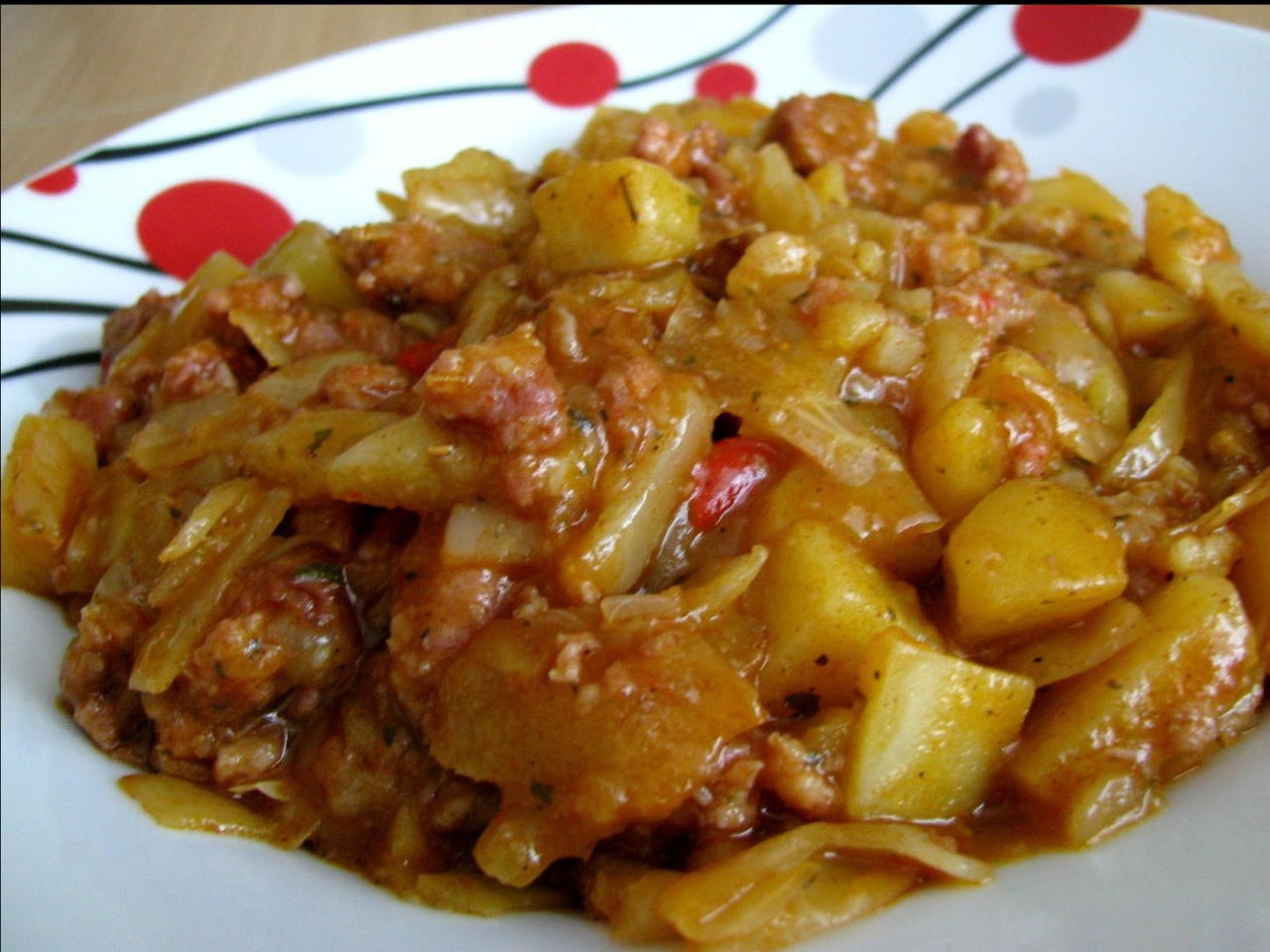 Czekamy aż kapusta nabierze złotego koloru a następnie dolewamy 500ml wody i wrzucamy ziemniaki.