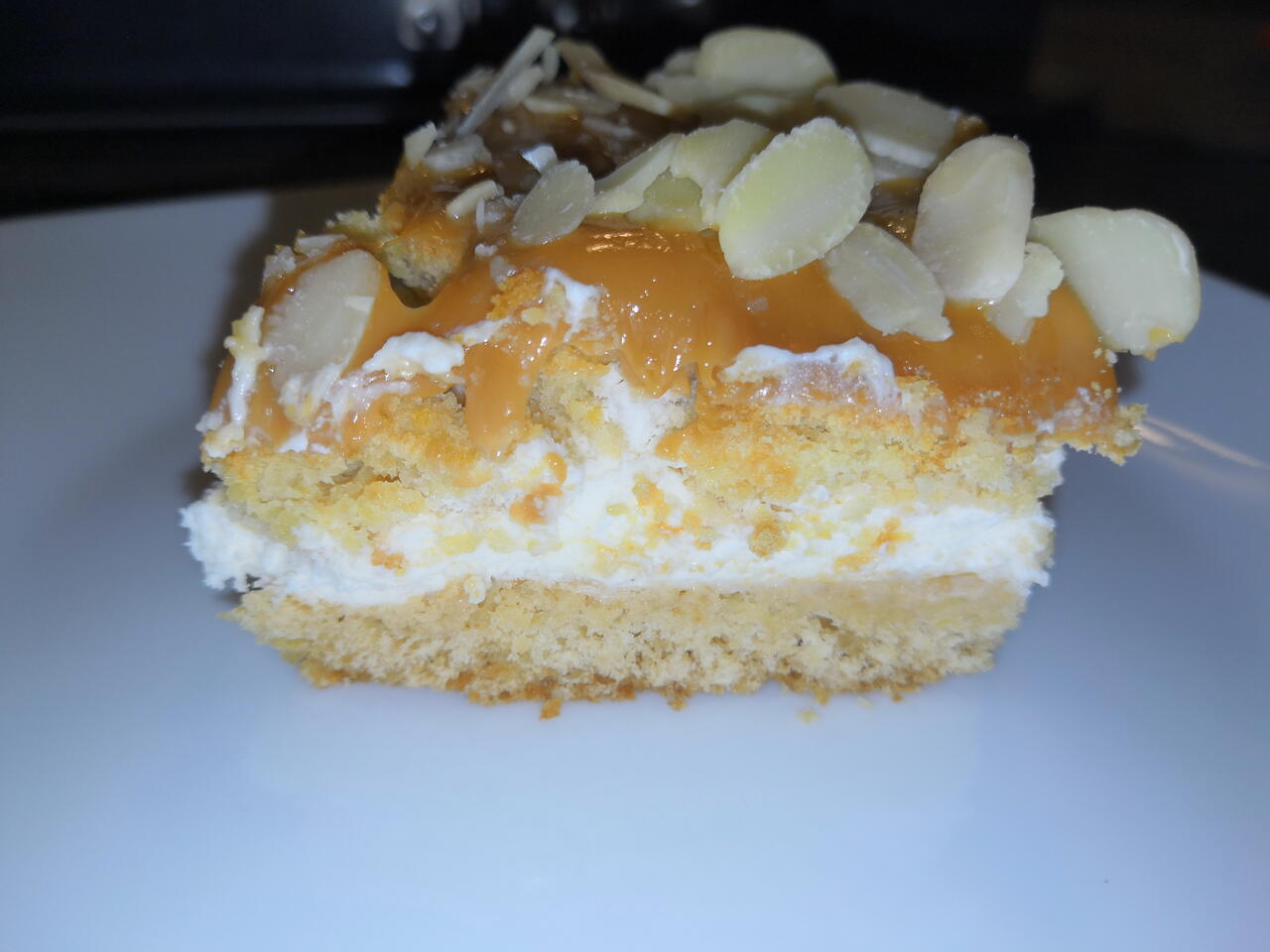 Na jedno ciasto upieczone ostygniete wykladamy całą masę śmietankową na to kładziemy drugą warstwę ciasta, masę krówkową i posypujemy płatkami migdałowymi. Dobrze jest zostawić ciasto w lodówce na noc żeby ciasto zmiękło.
