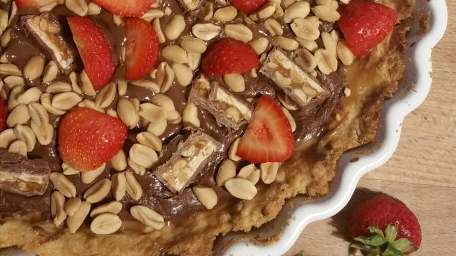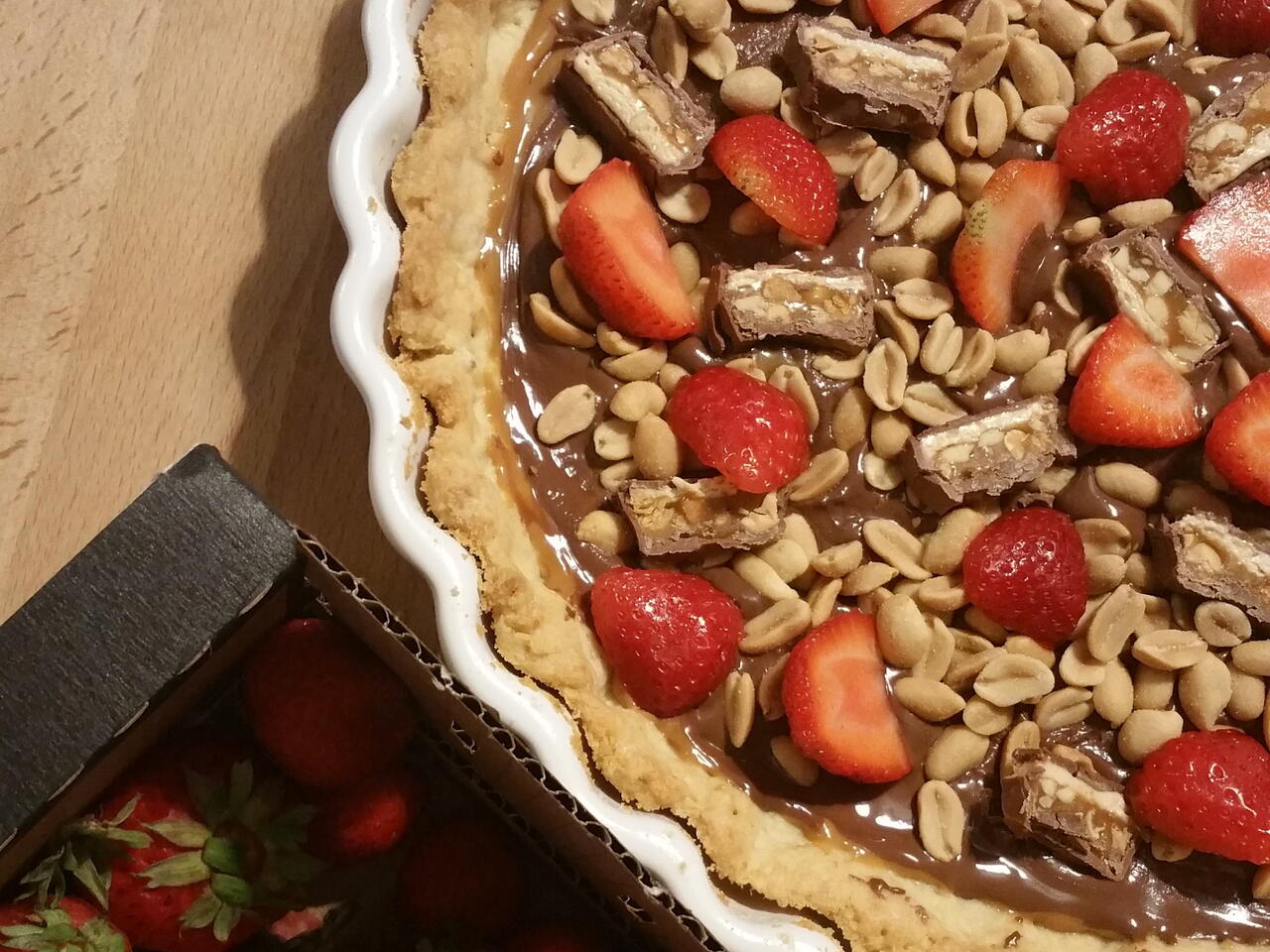 Czekamy aż spód wystygnie. Następnie w kąpieli wodnej rozpuszczamy połamane kawałki czekolady. Rozprowadzamy przygotowaną bądź kupioną masę kajmakową na spodzie, wylewamy płynną czekoladę, następnie sypiemy orzeszkami, pokrojonymi truskawkami i batonikami snickers, jeśli się na nie zdecydowaliśmy.
