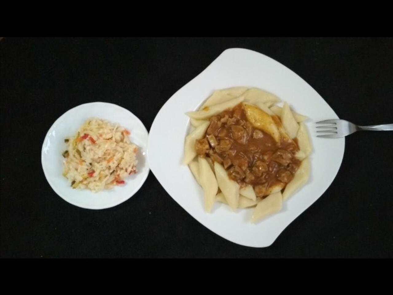 Wkładamy je delikatnie do gotującej się wody nie przerywając jej wrzenia. Mieszamy by nie przykleiły się do dna garnuszka i gotujemy około 3:30 min.(powinny już jakiś czas unosić się na górze). Wyławiamy je od razu na talerz, dodajemy gulasz i podajemy z surówką lub korniszonym 😉