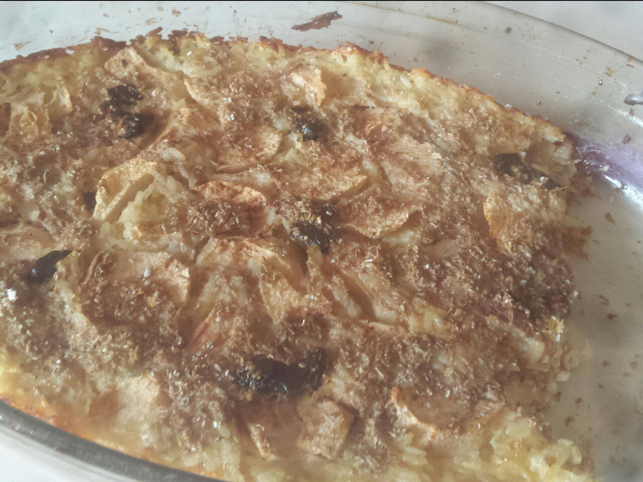 Następnie wyłożyłam jeszcze jedna warstwę ryżu i jabłek . Dodatkowo posypałam otrębami i cynamonem po wierzchu i wylałam mleko i odrobinę wody tak żeby było lekko zamoczne żeby się nie przypalilo w piekarniku.